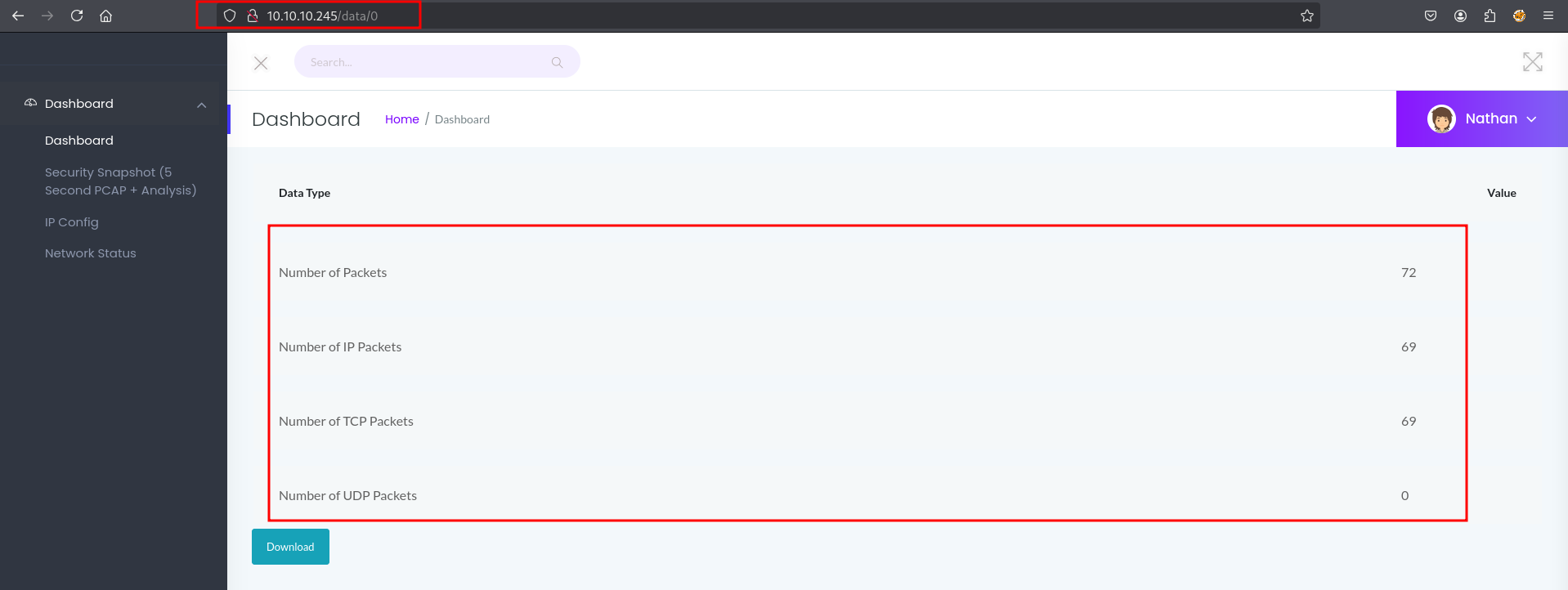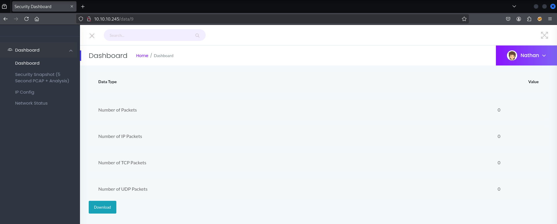 We set the data parameter to 0 in the URL (a simple IDOR vulnerability) and were able to access a .pcap file containing data, which we then downloaded to our Kali machine.