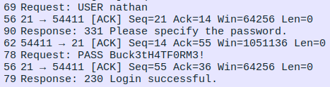 Analyzing the downloaded .pcap file, we found credentials that were used to log in to the FTP service.
