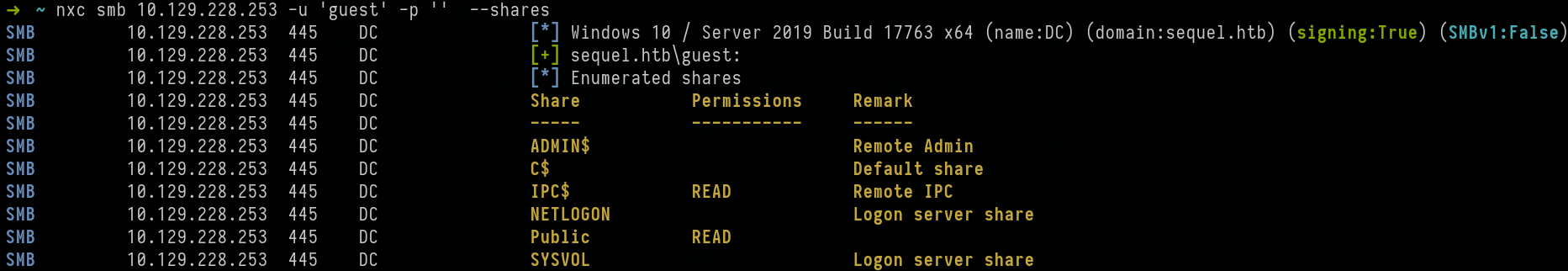 SMB 10.129.228.253 445 DC [*] Windows 10 / Server 2019 Build 17763 x64 (name:DC) (domain:sequel.htb) (signing:True) (SMBv1:False)