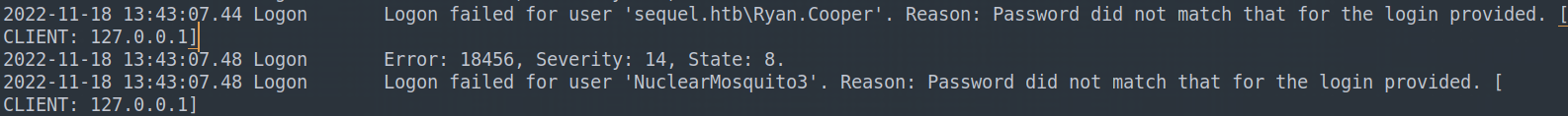 While exploring the file system as sql_svc, we found a SQL error log (ERRORLOG.BAK) in C:\SQLServer\Logs\. Within the log, we discovered credentials for the user Ryan.Cooper.