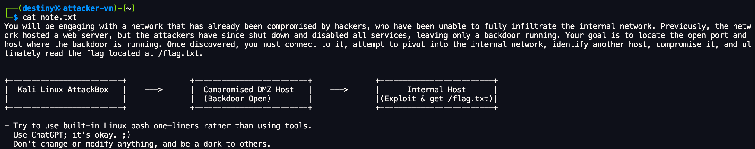 Note.txt After using SSH to log in to the attacker machine: