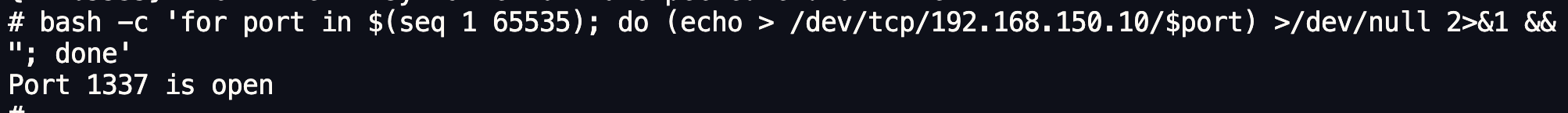 for i in $(seq 1 254); do (ping -c 1 192.168.150.$i | grep "bytes from" &) ; donebash -c 'for port in $(seq 1 65535); do (echo > /dev/tcp/192.168.150.10/$port) >/dev/null 2>&1 && echo "Port $port is open"; done'