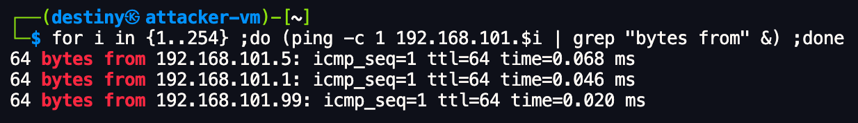 for i in {1..254} ;do (ping -c 1 192.168.101.$i | grep "bytes from" &) ;done