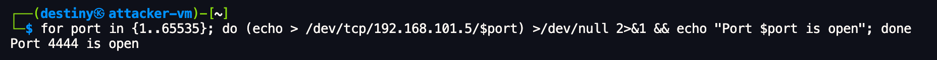Ran a port scan using Linux commands to identify open ports and was able to see that port 4444 is open.