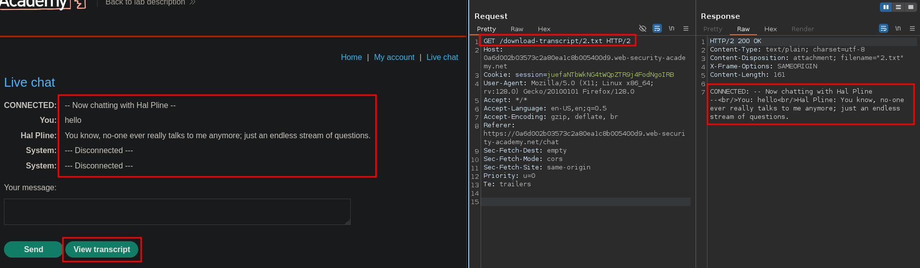 We were able to access a live chat application, and when we clicked the View Transcript button, it downloaded the chat to our desktop using a GET request as below :