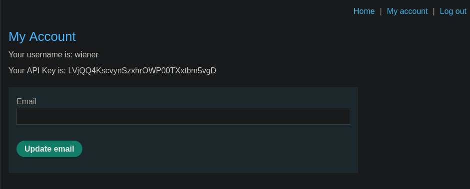 We logged in as the given user wiener and were able to see our API key