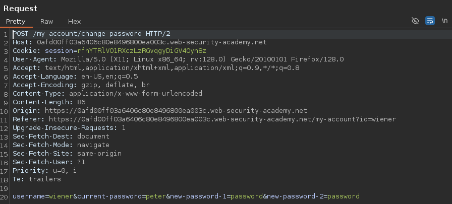 "Referer": "https://0ab40085037b57e280db5d43006700c2.web-security-academy.net/my-account/change-password",