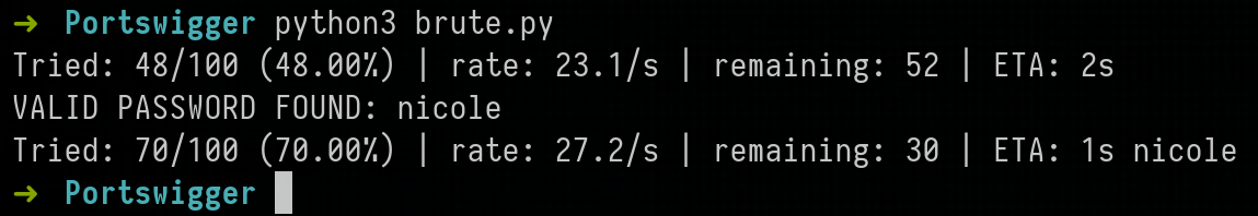 sys.exit(1)The script revealed that the current password of Carlos is nicole: