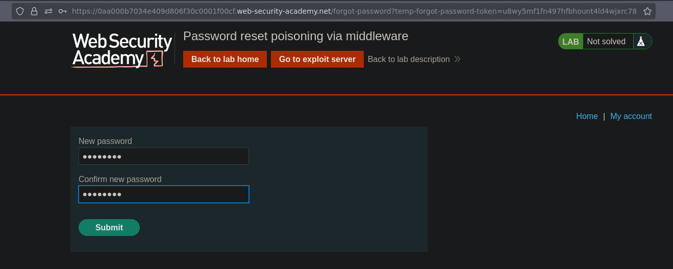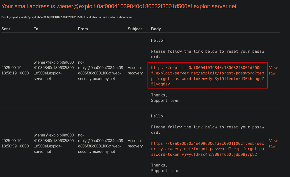 We observed in our email that the password reset link URL had been replaced with the exploit server link we supplied: