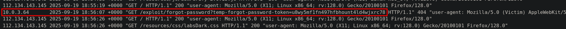 We sent the request with the username set to carlos and checked the web server access logs. We observed the reset token link being requested from an internal IP as a GET request: