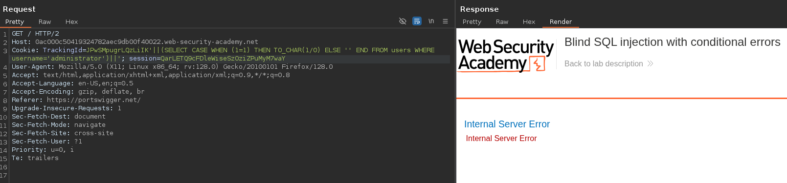 TrackingId=xyz'||(SELECT CASE WHEN (1=1) THEN TO_CHAR(1/0) ELSE '' END FROM users WHERE username='administrator')||'