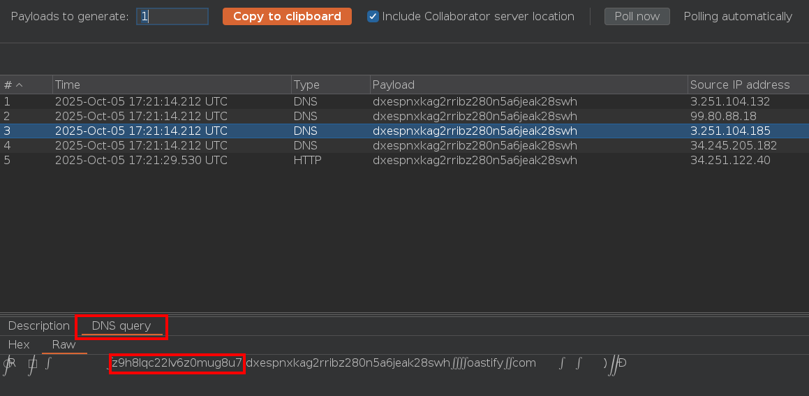 After sending the request and polling using Burp Collaborator, we were able to see the DNS lookup with the password of the administrator user from a public IP as below: