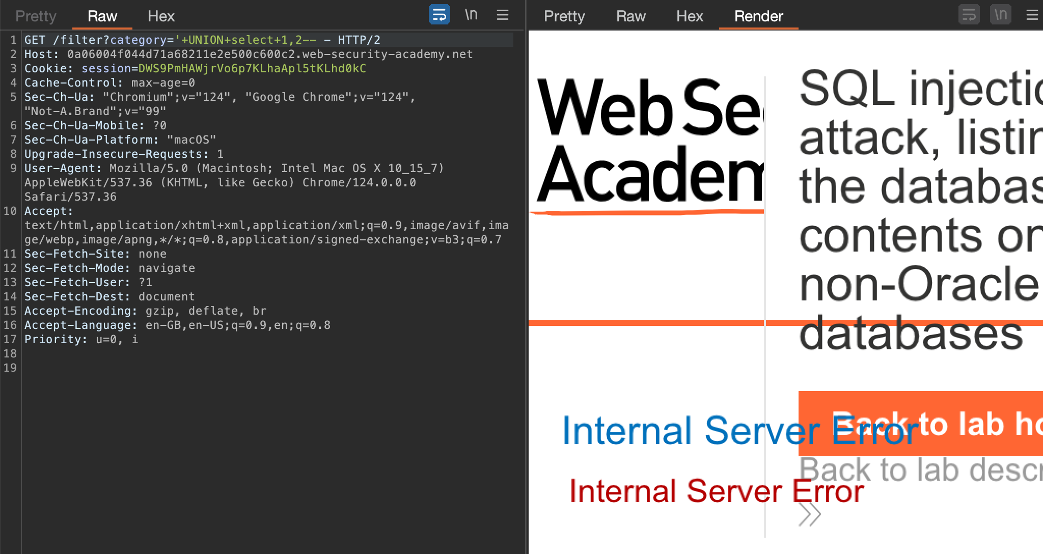 We used 1,2 to check how many columns we have using UNION injection and received an ‘Internal Server Error’ :