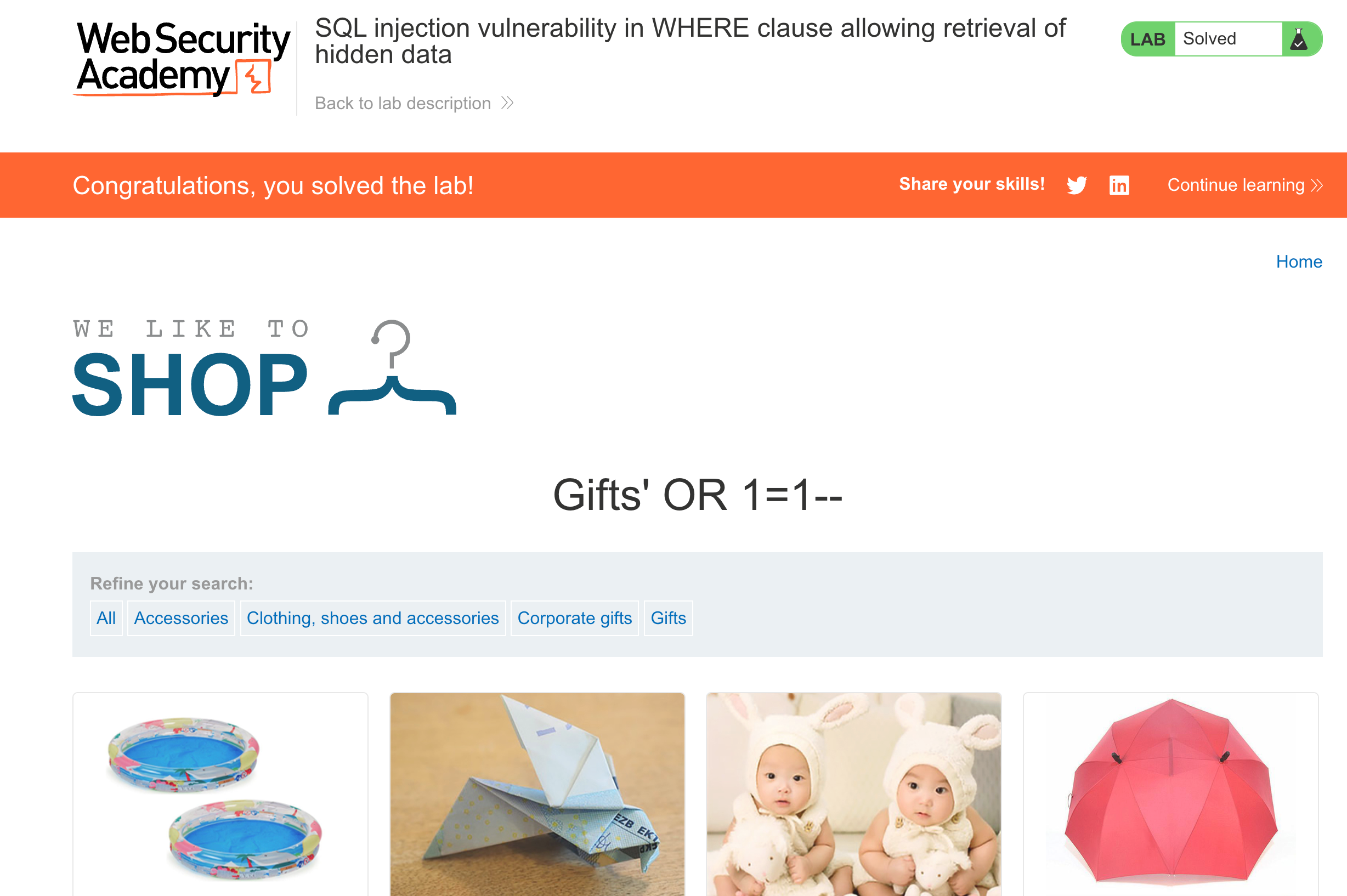 SELECT * FROM products WHERE category = 'Gifts' AND released = 1We used the following payload :