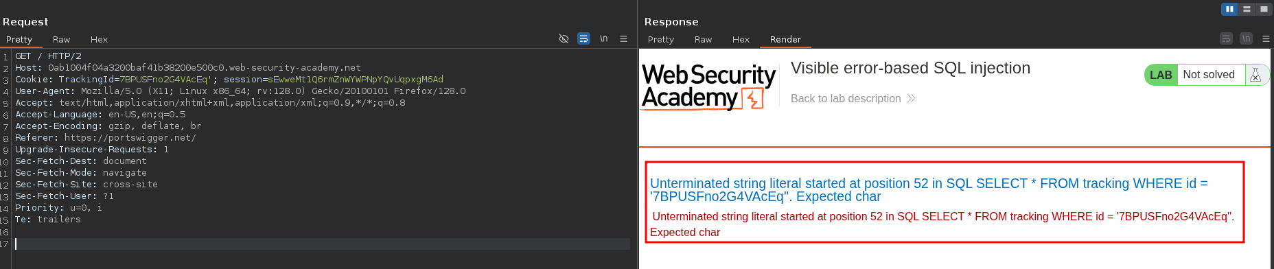 We received a TrackingId cookie, and editing it produced the full MySQL error: