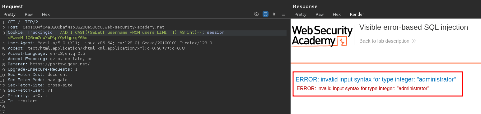 We used the following payload to leak the first username from the users table and observed that it returned administrator in the error response: