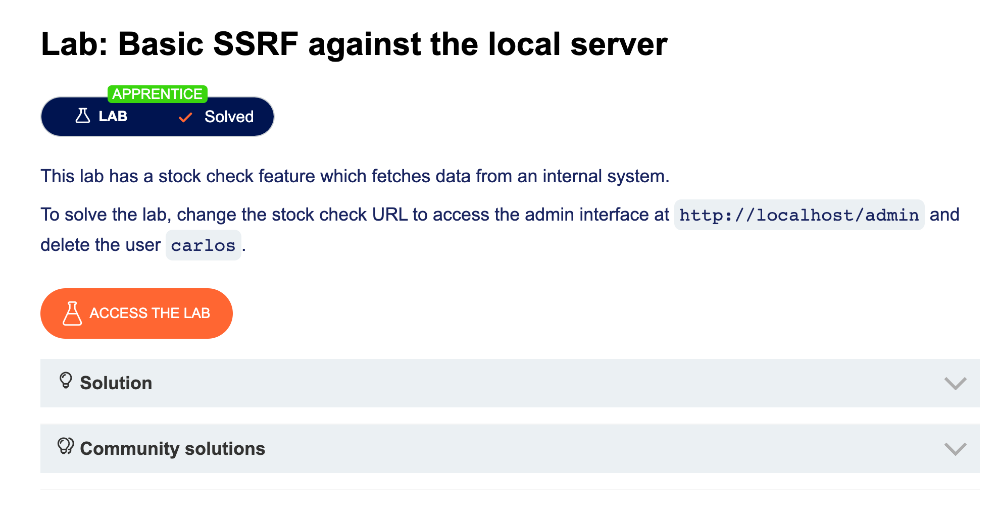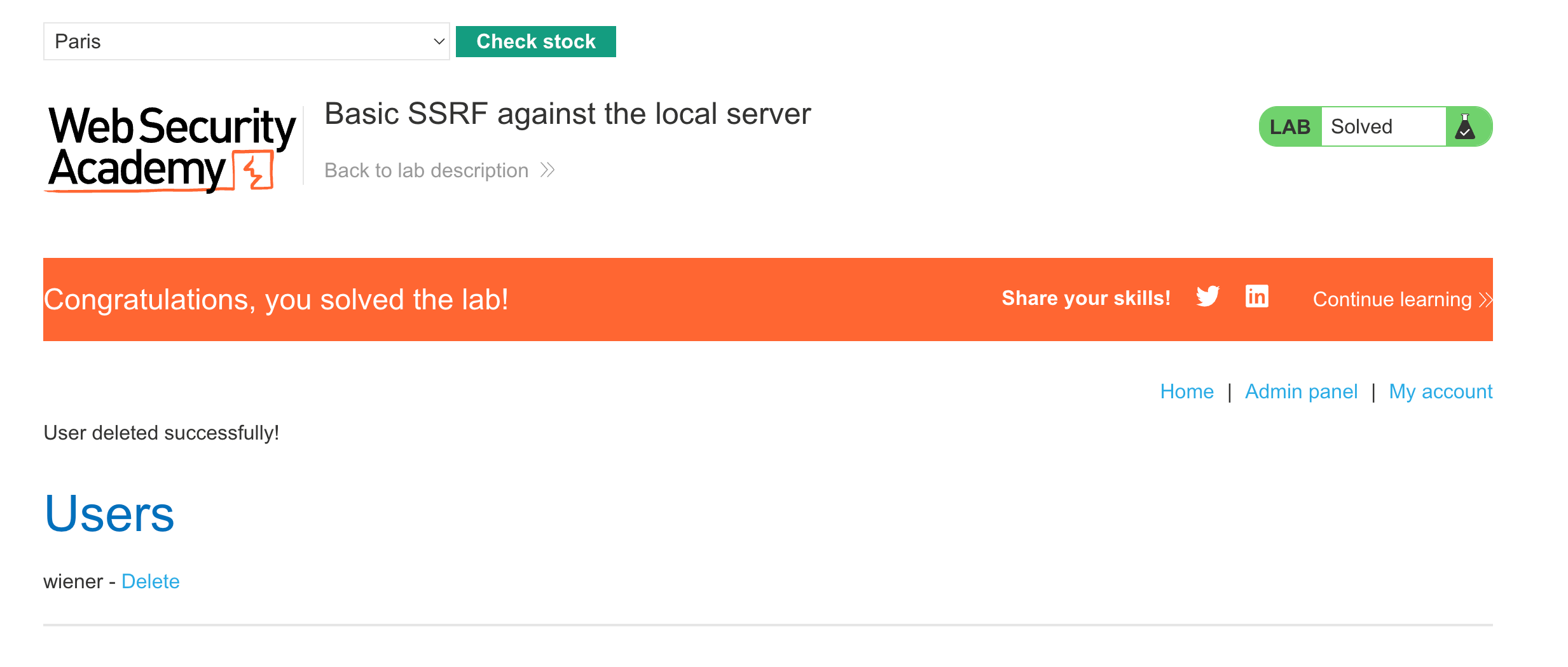 While visiting the /admin panel again from the SSRF, We were able to see that we have solved the lab :