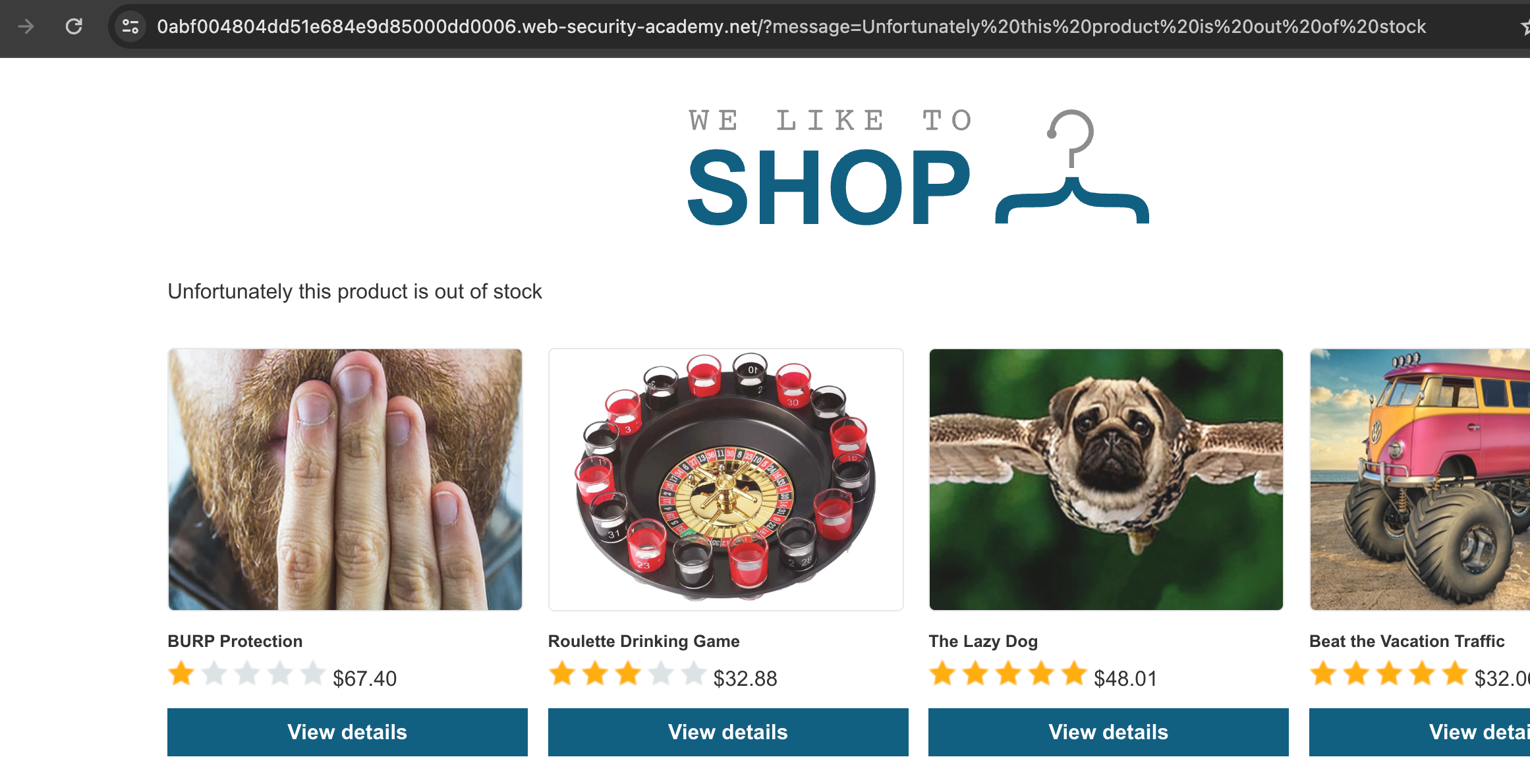 When we tried to view the details of BURP Protection , We were responsed with the message as Unfortunately this product is out of stock . We were able to see that in the url, this message was there in a ?message parameter .