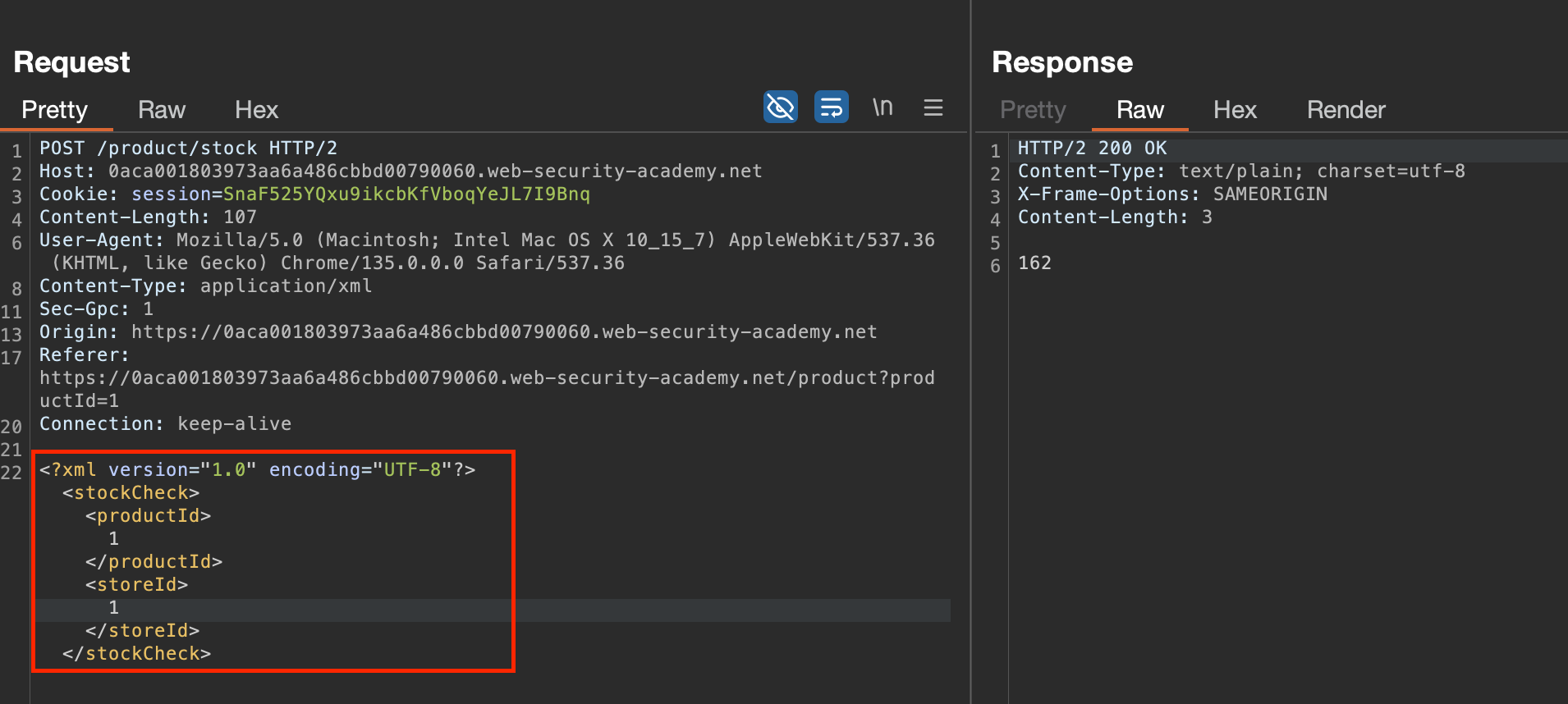 While clicking the Check Stock button and intercepting the request, we observed that the POST request was sent in XML format.