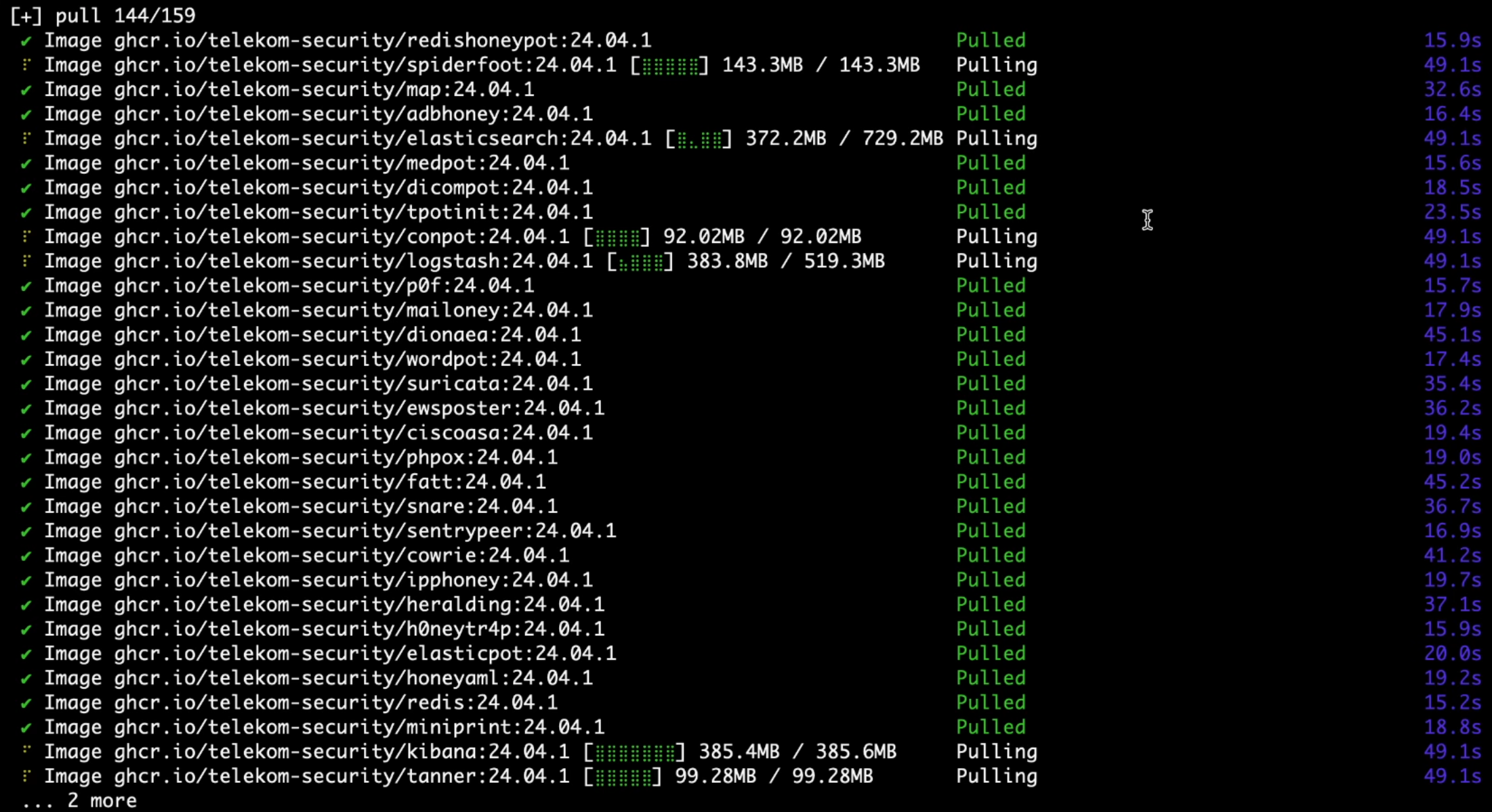 Once initiated, the script automatically pulls all the necessary Docker images for various honeypots and tools, including Cowrie, Dionaea, Elasticsearch, Kibana, Logstash, and many more.