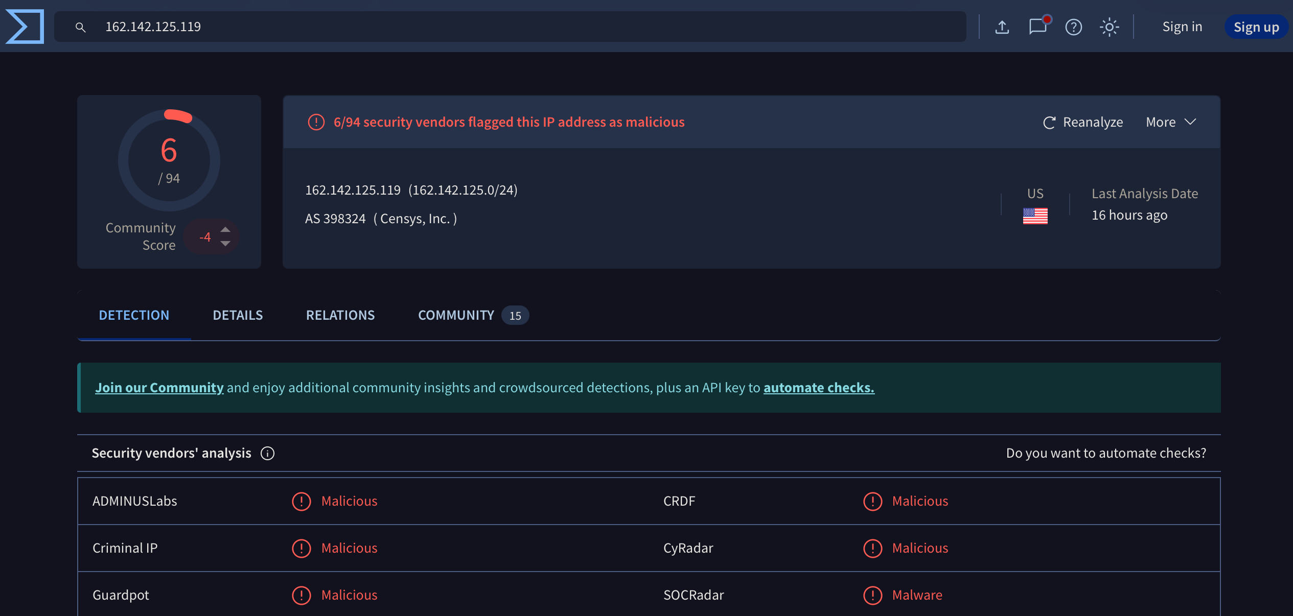 Unsurprisingly, 6 different security vendors had already flagged this IP address (associated with AS 398324 / Censys, Inc.) as malicious or malware. Vendors like ADMINUSLabs, CRDF, Criminal IP, CyRadar, Guardpot, and SOCRadar all recognized the threat.