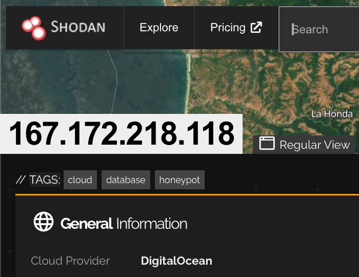 It did not take long for the open internet to discover my server. In fact, the search engine for internet devices, Shodan, has already indexed my IP address, 167.172.218.118, and correctly identified me as a honeypot and a cloud database.