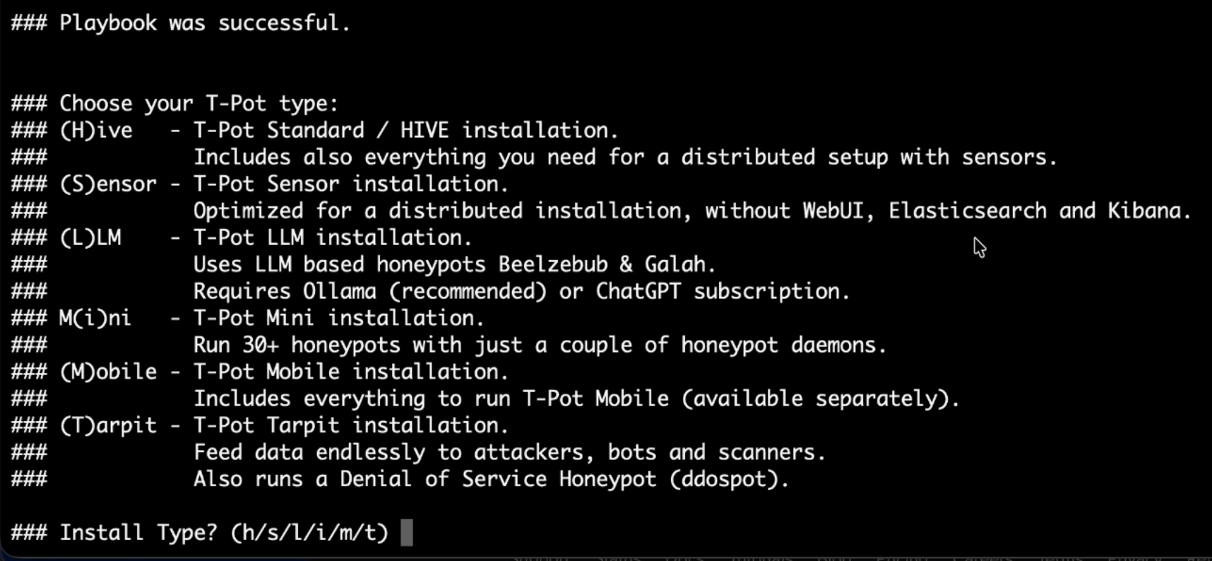 During the ./install.sh process, the script will ask you to choose your installation type. I selected option H for the (H)ive - T-Pot Standard / HIVE installation. This option installs everything you need for a distributed setup.