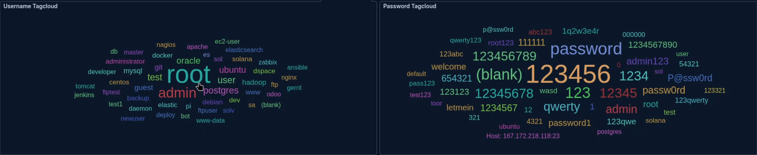 By looking at the Kibana tag clouds, I could see the brute-force dictionary attacks in real-time. Attackers rely heavily on default and lazy credentials.