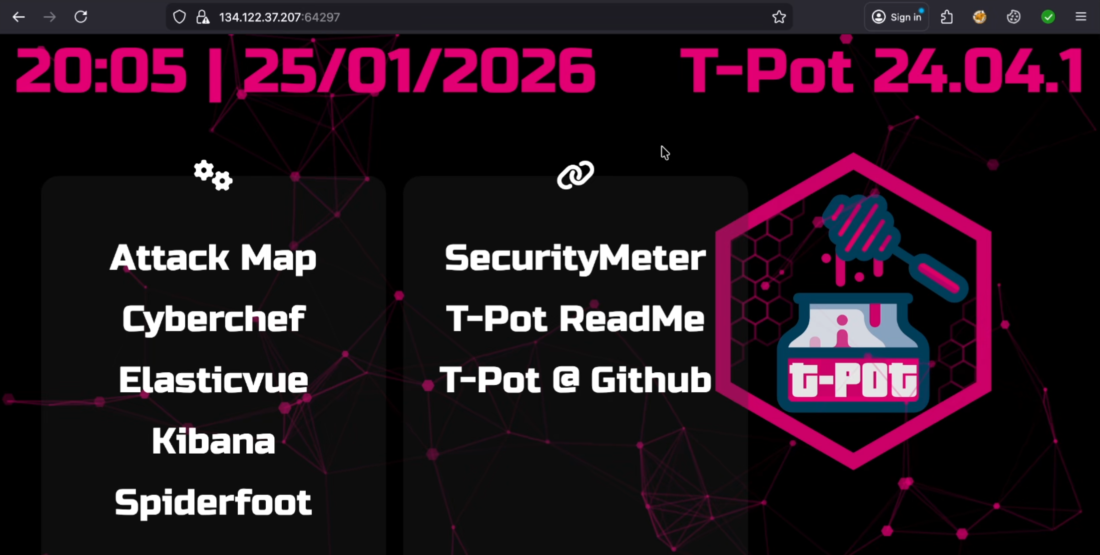 After the installation finished and the system rebooted, I accessed the T-Pot dashboard through my browser by navigating to the server’s IP address on port 64297 (e.g., 134.122.37.207:64297).